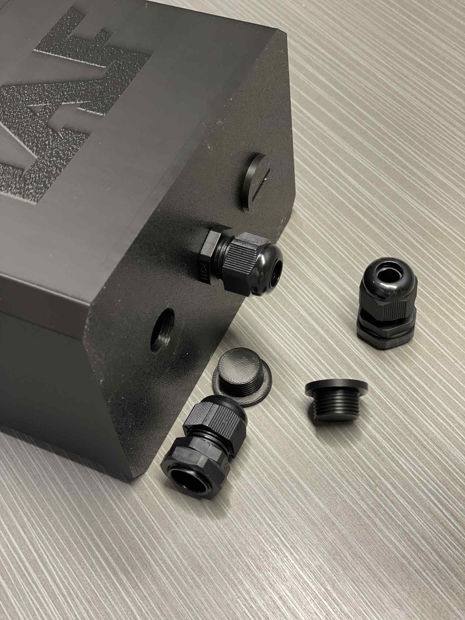 The back side has 3 holes with grommets included. We also include plugs for unused holes, and some short section of tech flex to make things nice. You can order with internal mounting holes as an option.